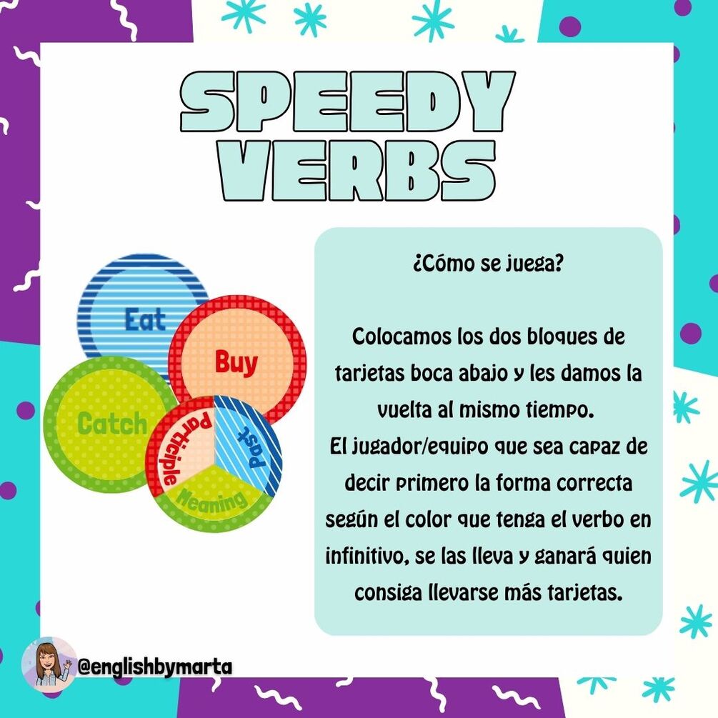 Speedy verbs es la versión del juego ‘Palabrea’ adaptado a Irregular Verbs. Mi versión se compone de dos bloques de tarjetas: 63 tarjetas de colores con verbos en su ‘infinitive form’ y 63 tarjetas con ‘Verb forms’. En este caso usé azul para ‘past’, rojo para ‘participle’ y verde para ‘meaning’.
